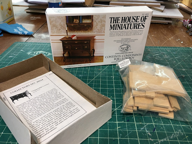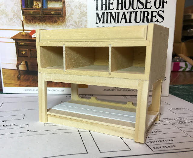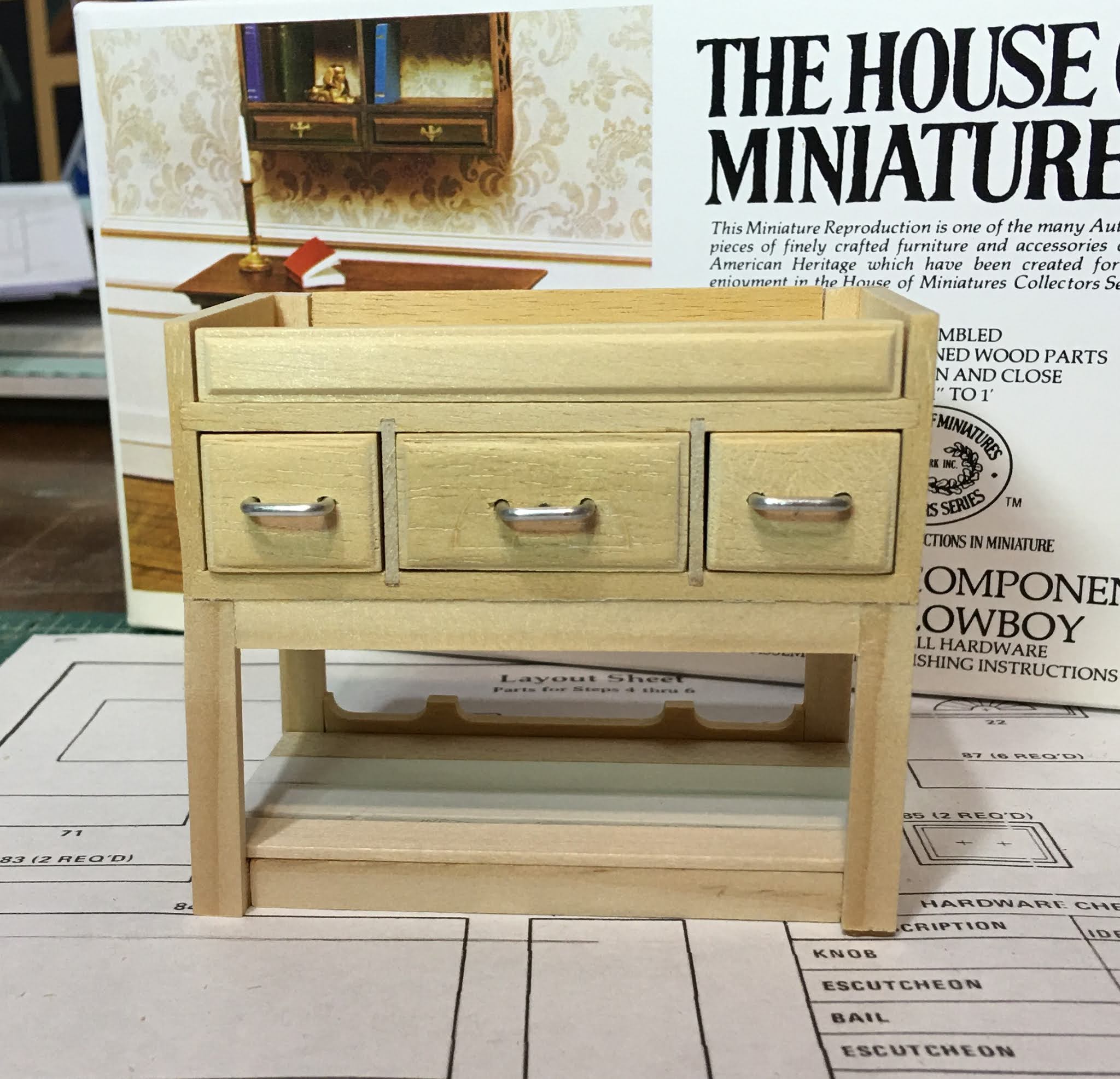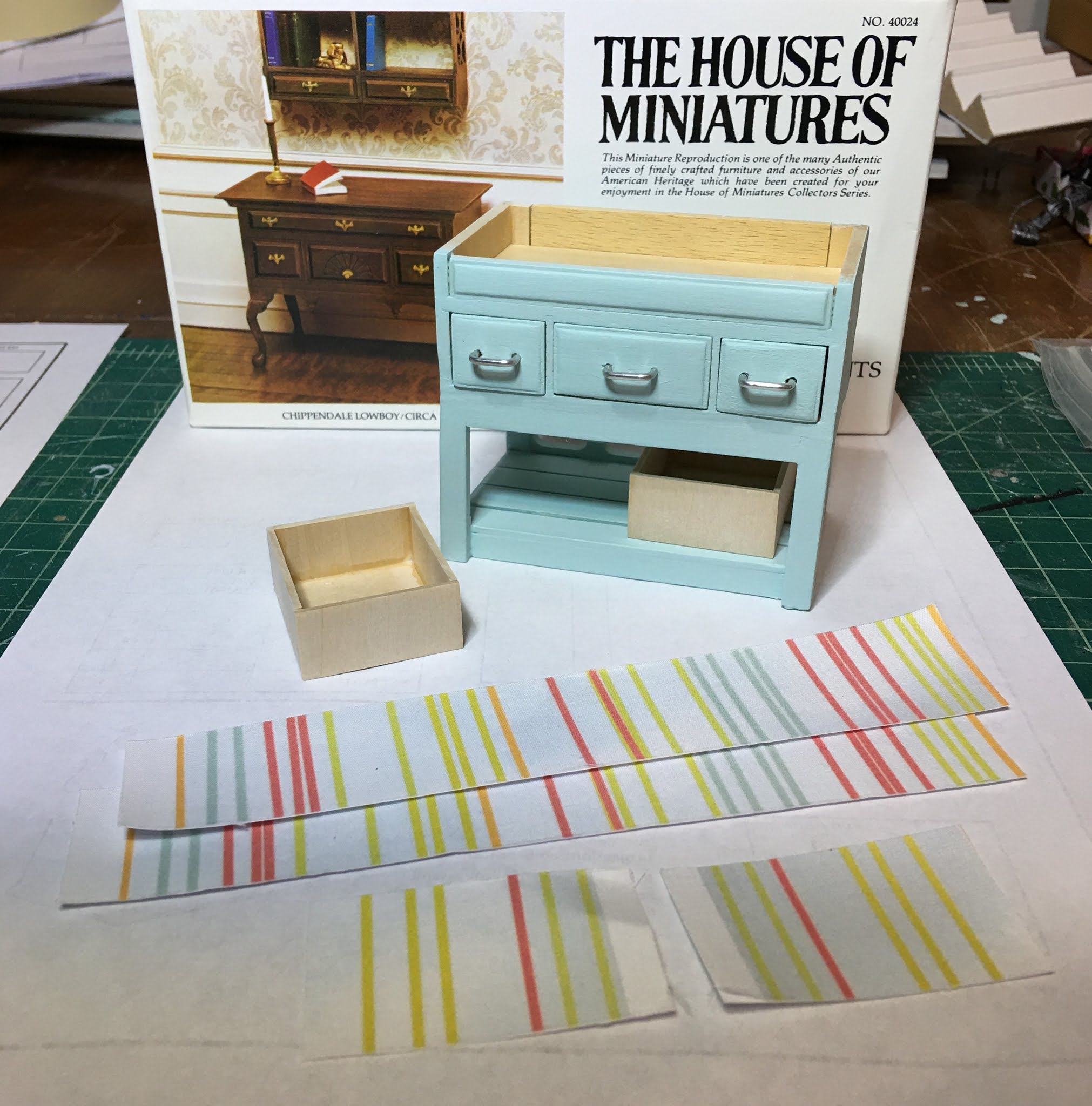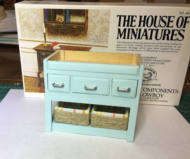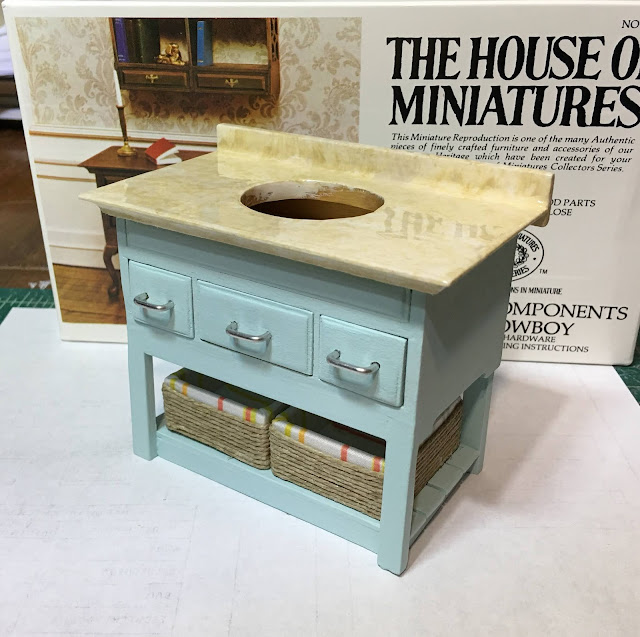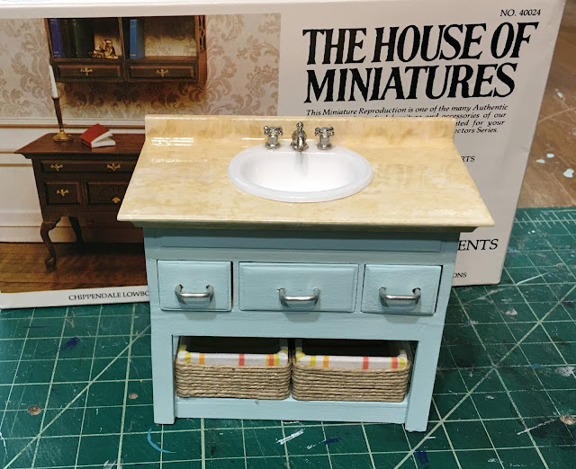 I started with a House Of Miniatures Lowboy kit and decided it would be great fun to remodel it a little. I put the cabriole legs away - they were too short since a vanity should be between 36" and 42" in real life (around 3" in mini), and instead made my own bottom. I wanted something beachy with storage baskets so this was the perfect solution.