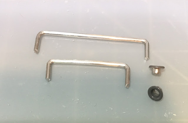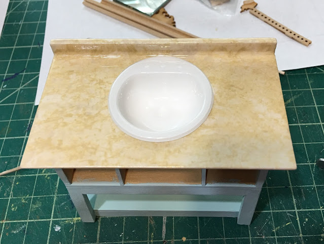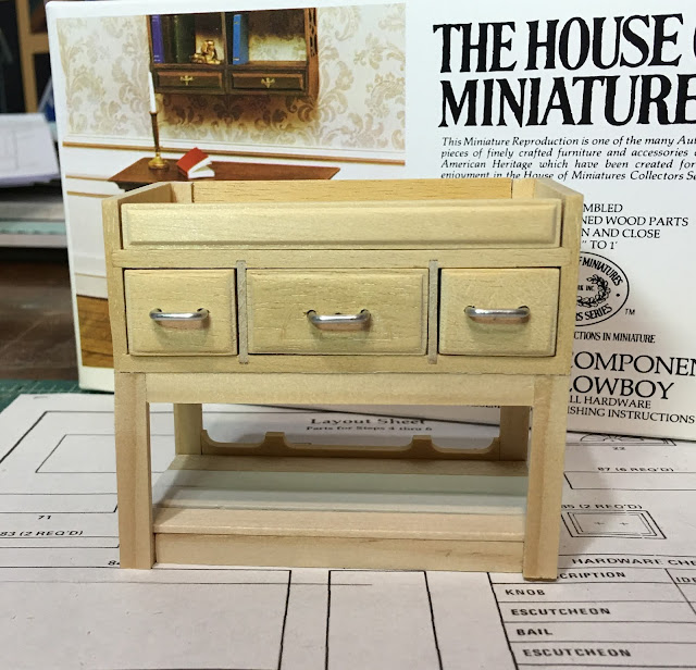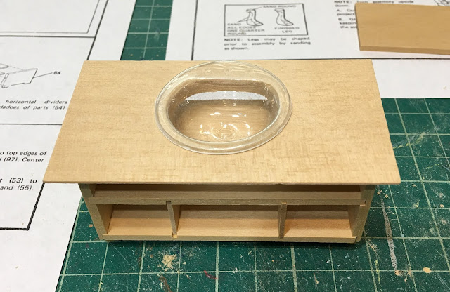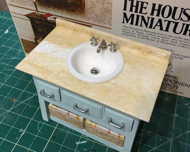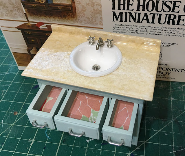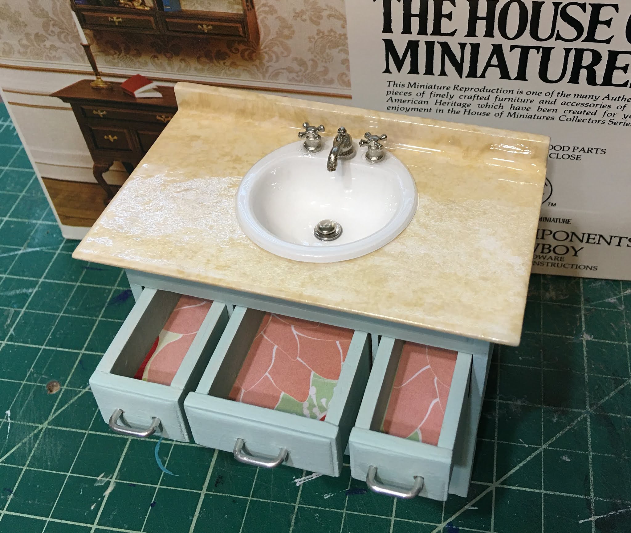 I had more of the Elf Miniatures handles in a smaller size that were perfect for the drawers. Looking at my stash, I also realized that I had an MBS plastic sink and could cut a hole into the HOM kit's top. Things were starting to come together!
