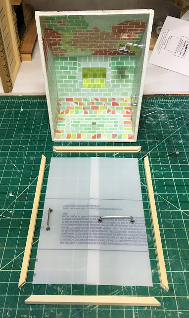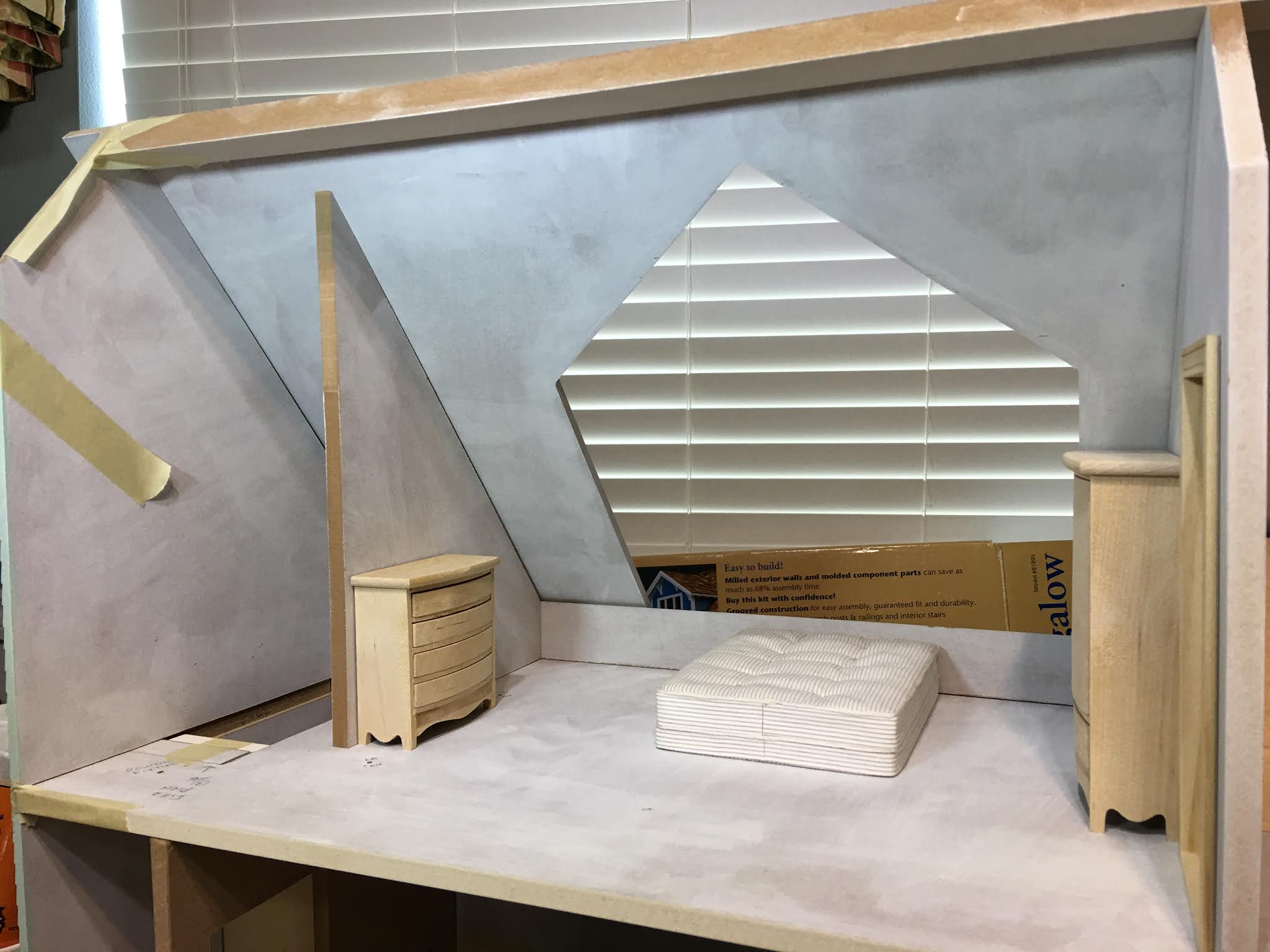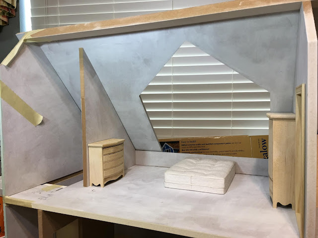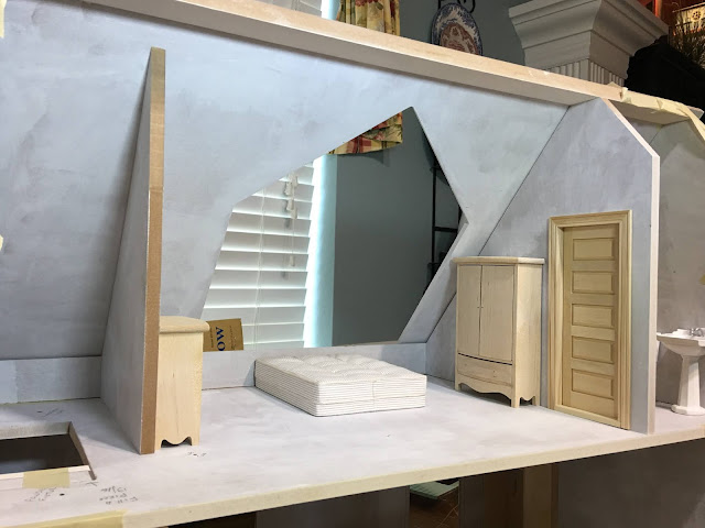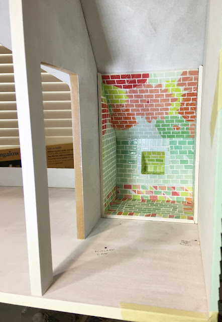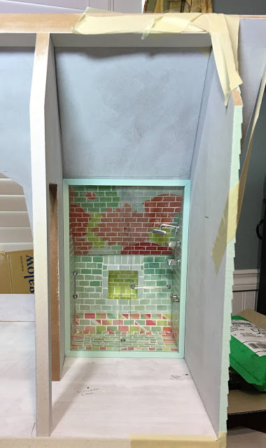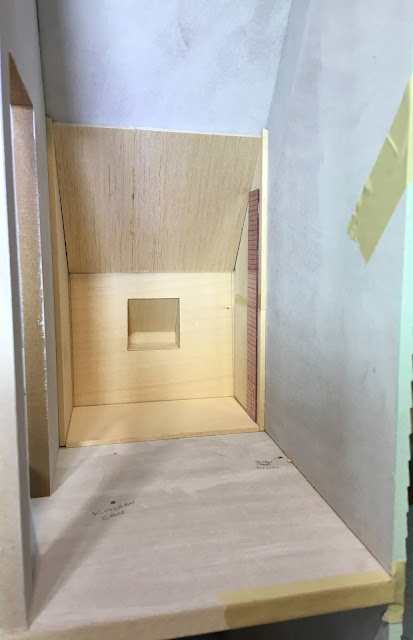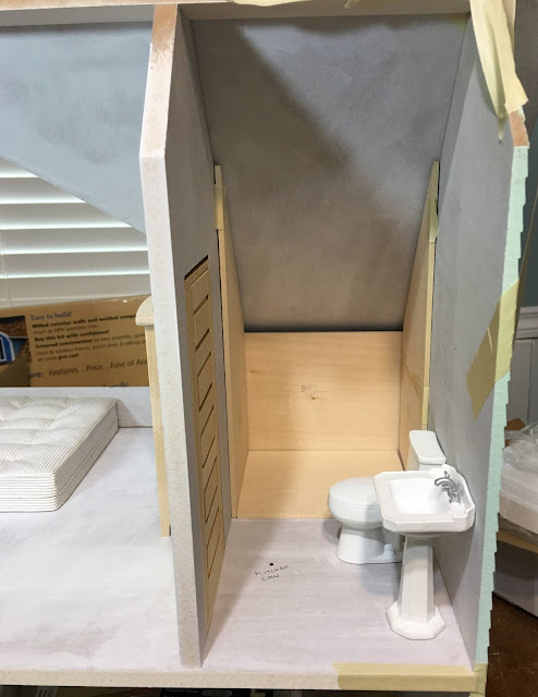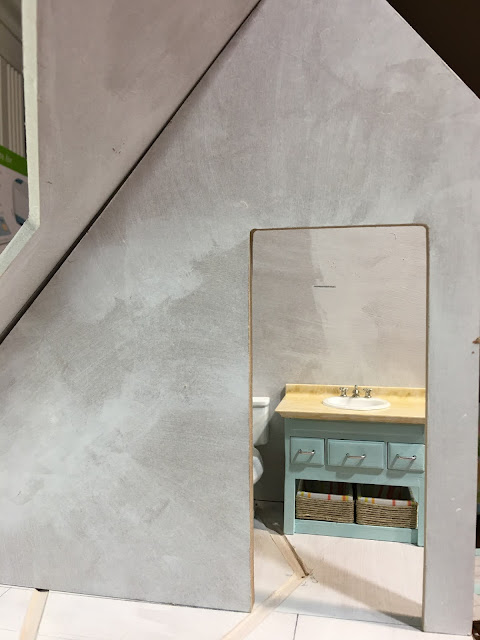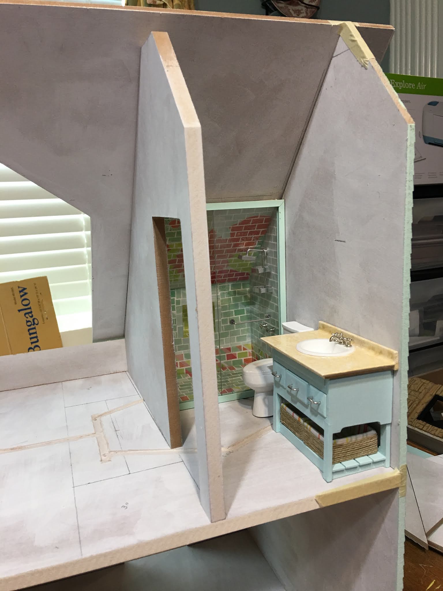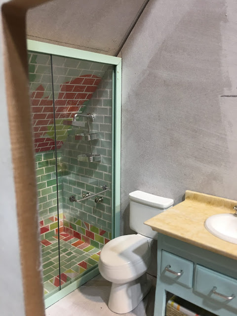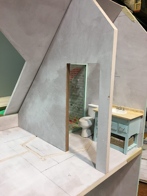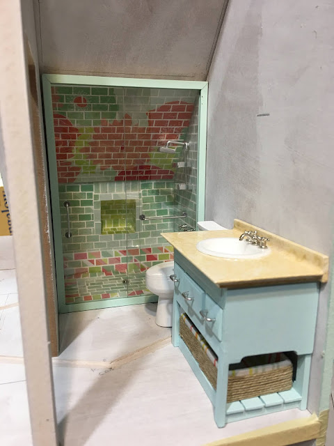 Before my parents' visit, I had been working on the Beachside Bungalow's bathroom. You see, I was in the Chicken/Egg dilemma. I needed to know where the upstairs dividing walls were going to go before I could mark the walls in dry fit. This was so that I would know which wallpapers would go where and where precisely they would begin and end. If you've followed my previous builds, you know I like to apply the wallpapers whenever possible when the walls are flat and separate - especially when using thin scrapbooking papers for wallpaper. They tend to crease, tear and wrinkle more easily when reaching in and applying to a vertical surface. Plus, as my eyes are getting older, I get a much better result with bright lighting and a closer view. What about the joins, you ask? Corner molding or quarter round work great, if necessary, and where two patterns meet a trim piece makes for a nice transition.