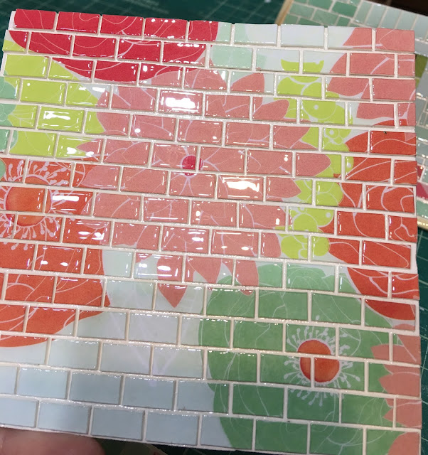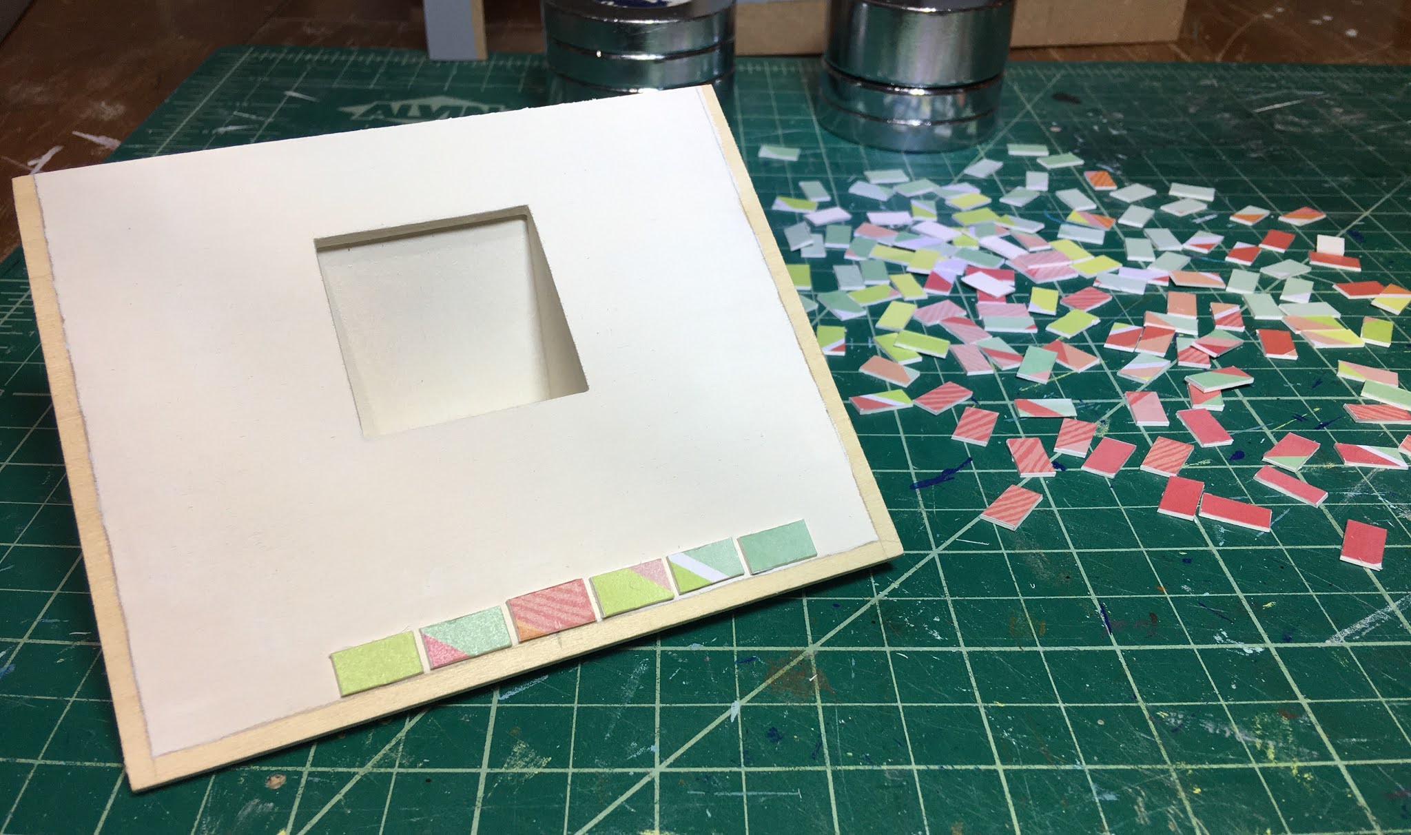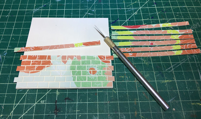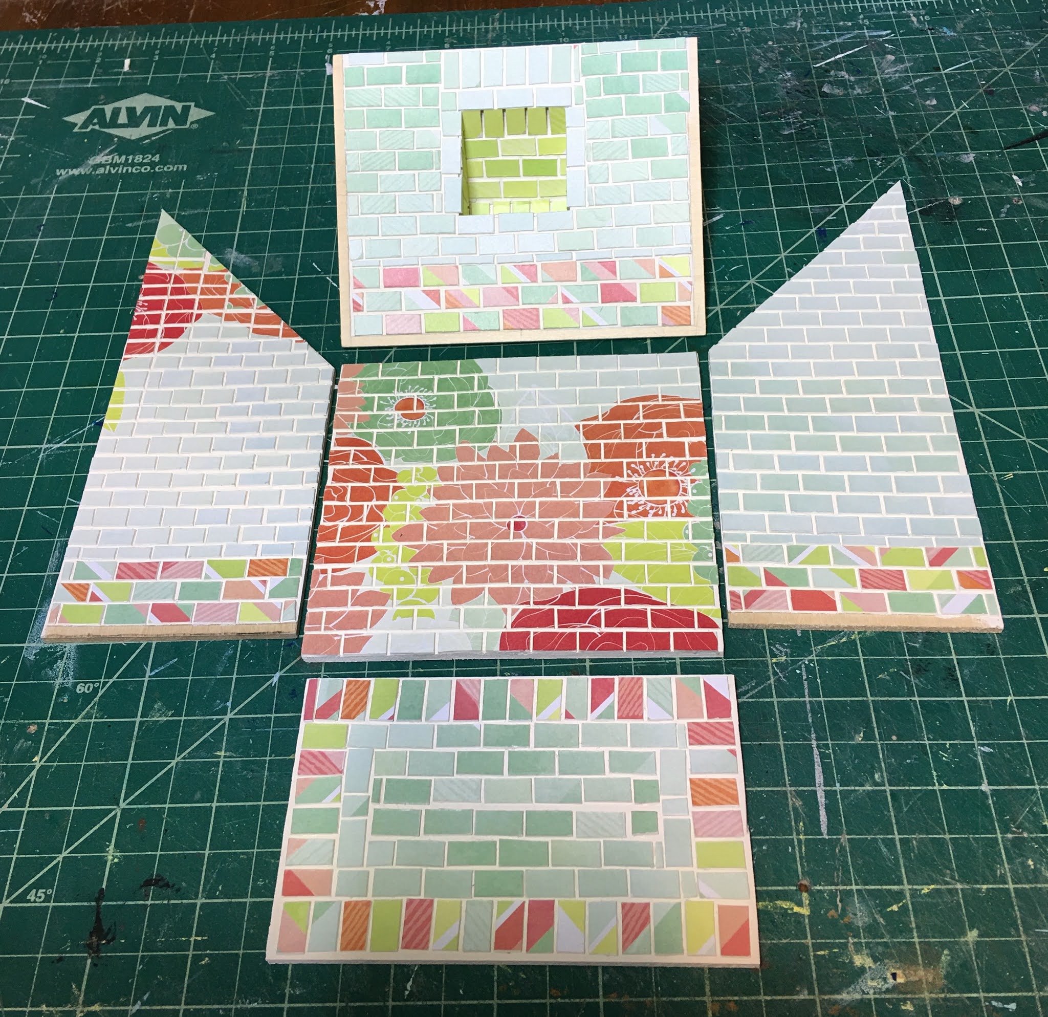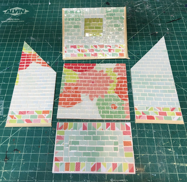 For the tiles, I took the same scrapbook stack that I am utilizing for the whole project and created tiles from the patterns. I used wallpaper gel to adhere the paper to mat board, then cut the tiles from that. I attempted to use my Cricut to cut the tiles for me, but could not find the right combination of blade, material, pressure and passes to cut the tiles through cleanly. After a fair amount of invested time, I decided the job would be easier accomplished by hand. I actually enjoyed it! At first, my tiles weren't perfectly consistent, but like with any job, I got better with practice. I used tacky glue to adhere the tiles to the primed wood and applied them by eyeballing it.