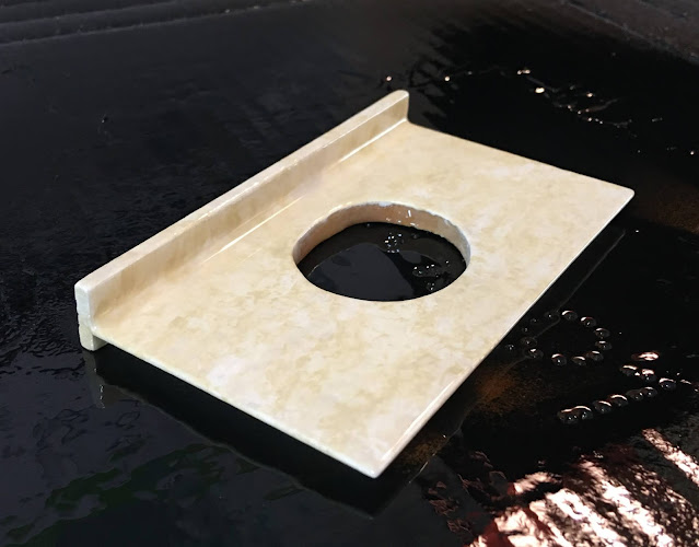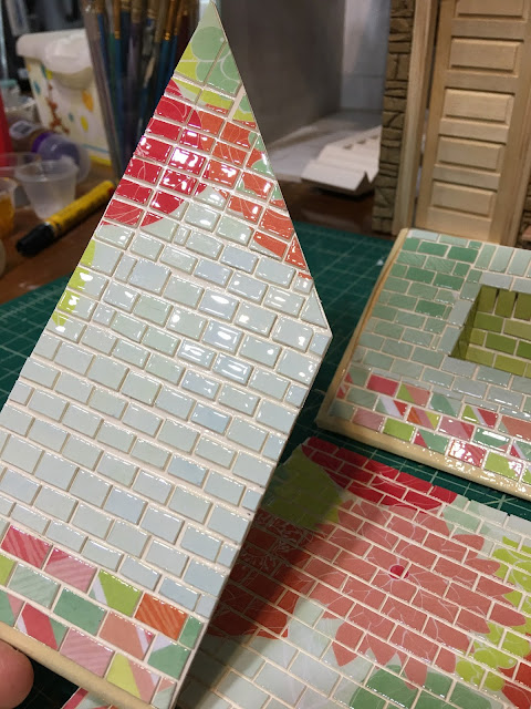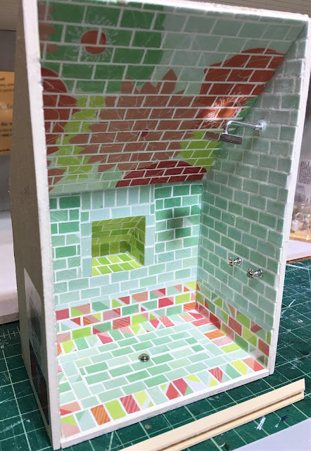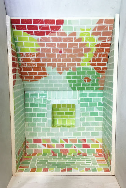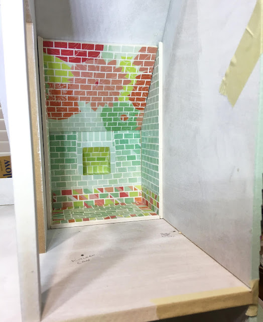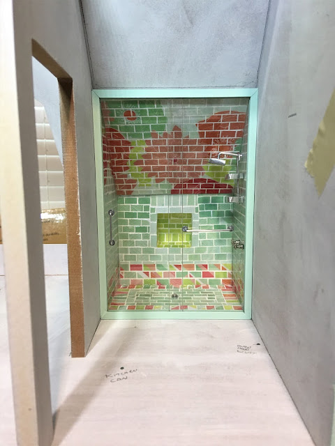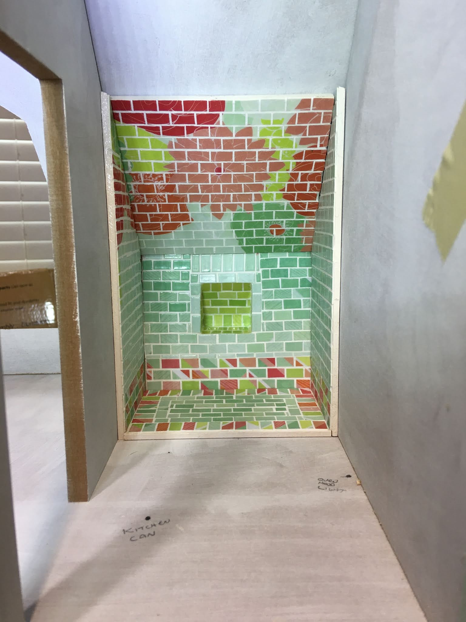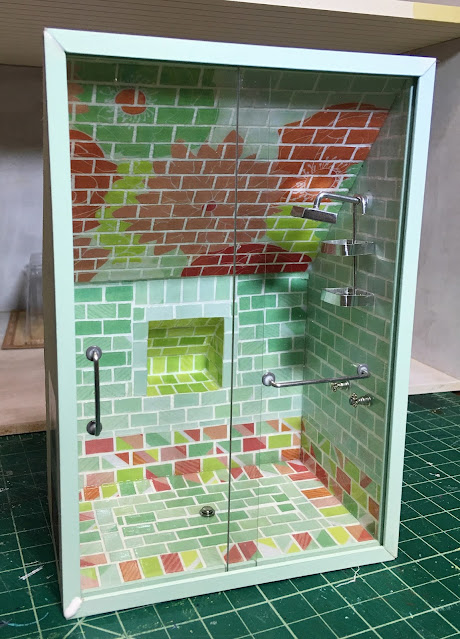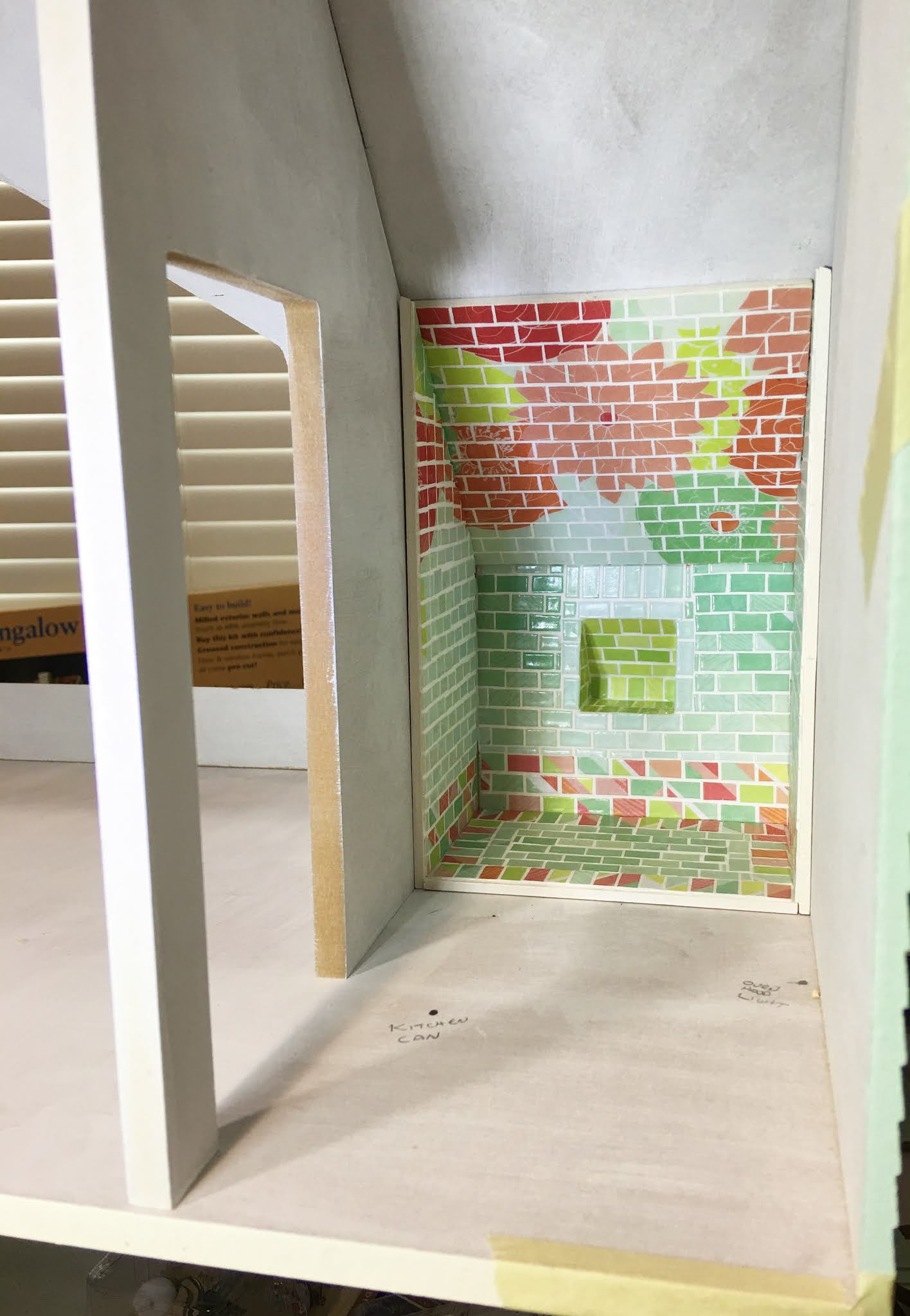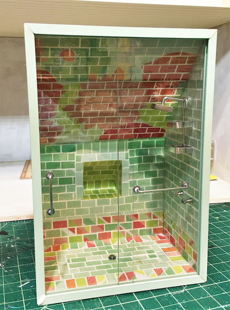 Once they were applied, I sprayed them with several layers of Krylon Triple Thick Gloss. Then I applied lightweight spackle for the grout. Once they were dry and cleaned up, I glued the shower pieces together.