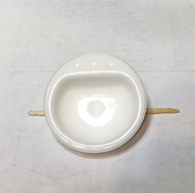 For the handles and the shower head, I had some chrome pieces from Elf Miniatures in my stash. I drilled holes in the Lexan big enough for tiny brads to seat into, then glued the chrome handle and towel bar through them. For the taps, I made them from spacer beads, corsage pins and earring backs. There is really nothing more fun to me than creating home spun minis with things from my stash!