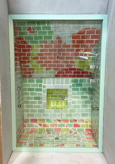 By the time I got to the shower's ceiling, I was pretty happy with the tiles and tiling job. I thought about starting over with some of the pieces to get a better result, but I just didn't have the heart (or the time!). I still liked the results, they are just more whimsical in style. We'll just say that the homeowner enjoys DIY!