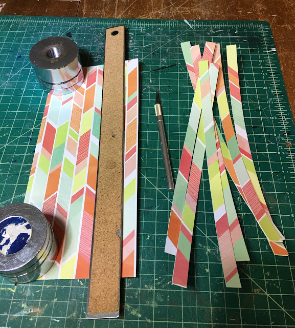 I made little baskets using Julie Warren's great method of wood lined with fabric then covered in hemp. For my material, I scanned one of the striped patterns from the scrapbook paper stack and then printed it on fabric paper.