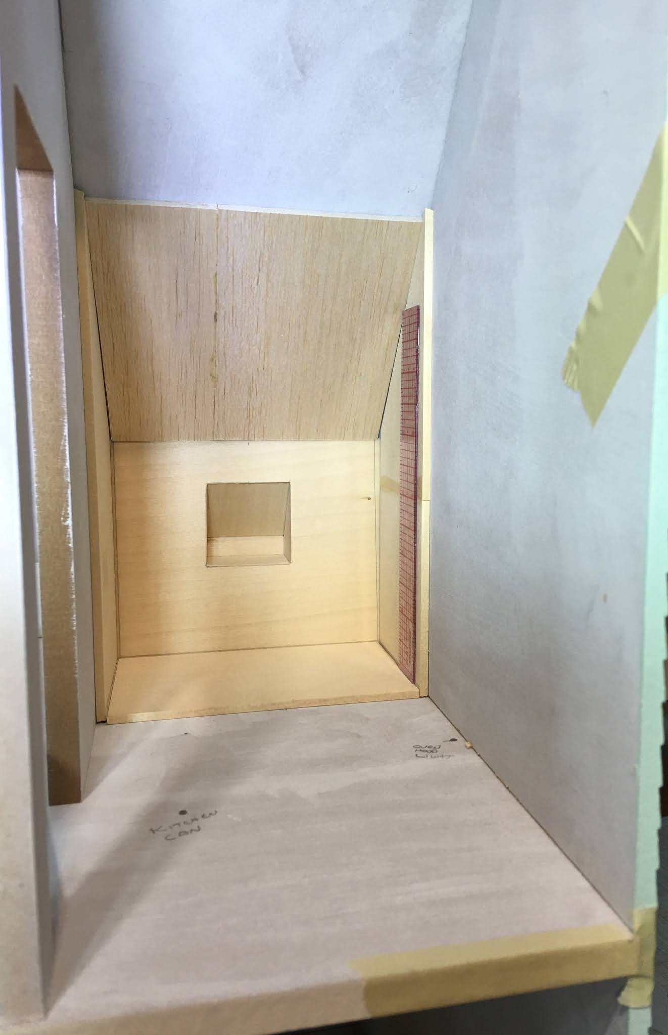 I started with some 1/16" basswood, making a floor, back, sides and a top. I also added a cubby shelf for shower necessities. This sink is just a place holder. Even in a dollhouse, a pedestal sink is just impractical in a main bathroom unless you have a massive linen closet! I had to make the shower deep enough so that the height would accommodate a six foot dollhouse person. Any taller than that and you'll just have to duck or bathe in the ocean, lol!