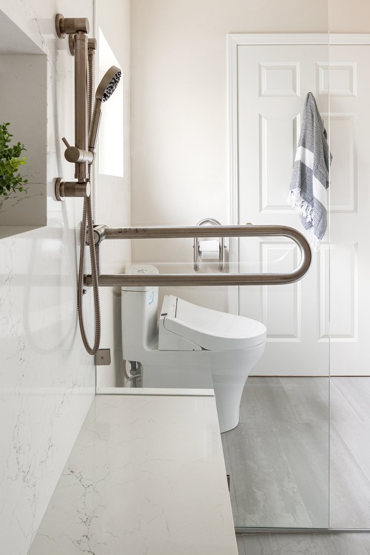 Grab bar tucked out of the way in a bathroom designed by Waldron Designs.