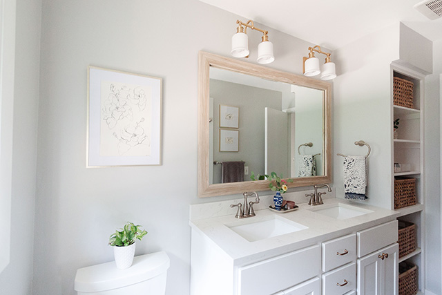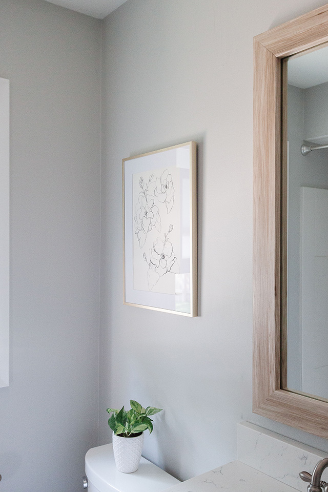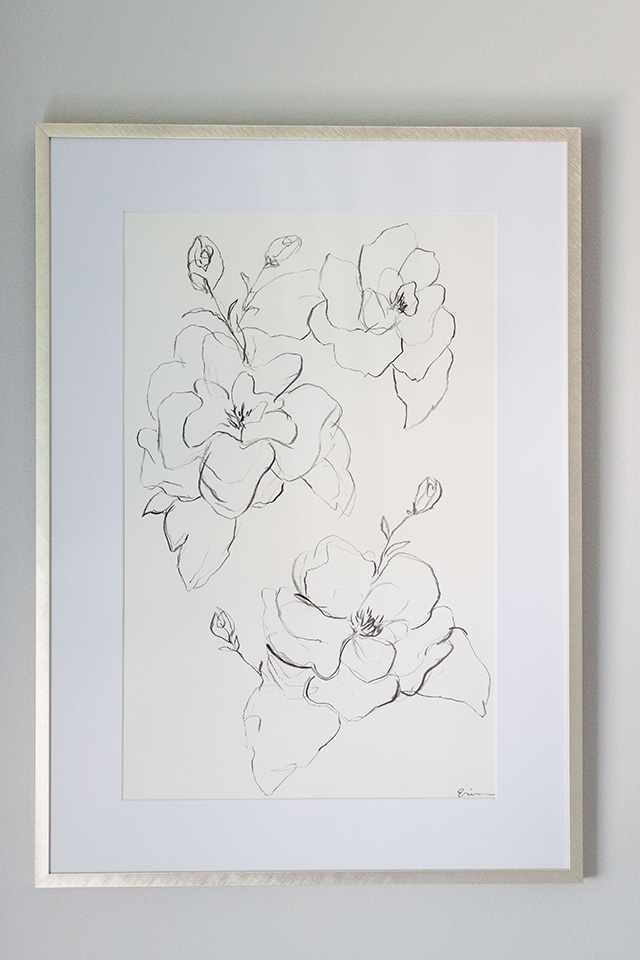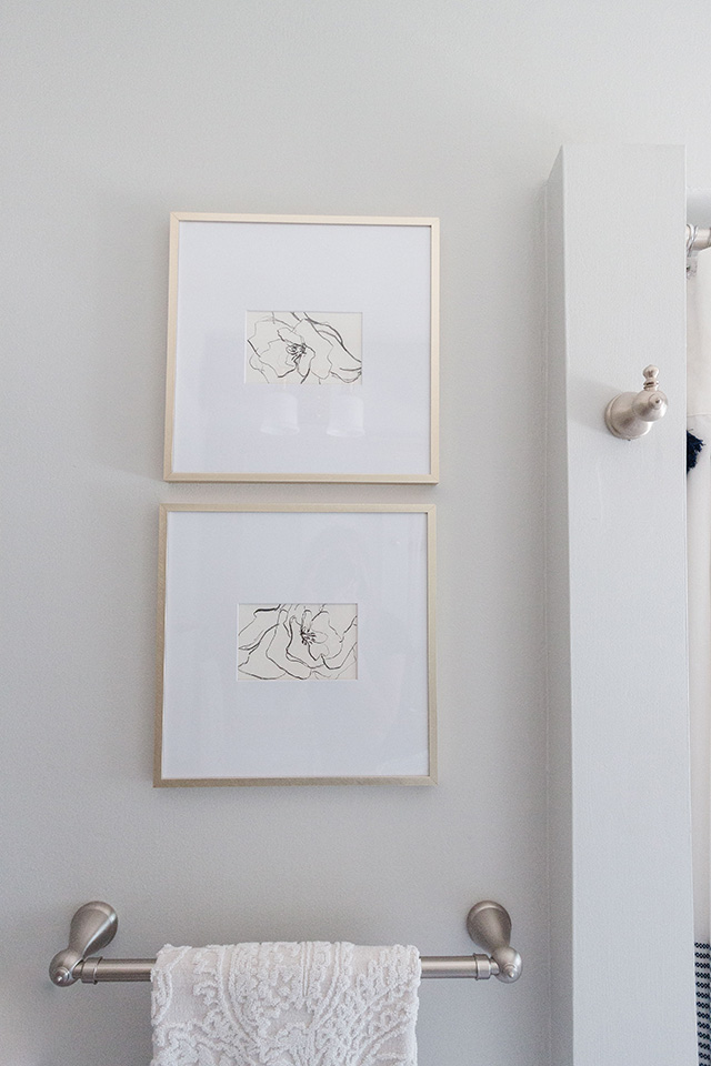 This bathroom renovation and decoration process has been, as they say, slow and steady! That's sometimes how it has to go and that's totally fine-- sometimes even better than rushing! The bathroom is finally done with all we're going to do to it this year. We may retile the floor this winter in the new year (what a good project to leave to do in winter, in case everything shuts down again...) For now though, we updated our art with some beautiful charcoal line drawings by my friend Erinn Schultz and I had to show you them hanging up in their frames!