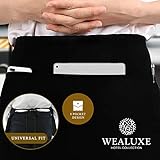 Will Well - Soft to touch comfortable to wear Made of premium polyester fiber which belongs to uniform cloth touch and feel like cotton material Free from harmful substances safe for you and your family Unique design black aprons that is perfect for women and men chef waitress The material is a light duty thin material good enough for everyday kitchen cooking also great for cleaning painting serving flipping furniture and many more 33x 27 size large cooking aprons covers from chest to knee Adjustable neck strap for a most comfortable wearing Extra long 38 ties can be wrapped from the front or from the back depending on the users comfort 2 pockets in the middle of apron for easy holding meat thermometer grill slips phones recipe cards etc