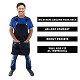 Aprons for men with large pockets bib apron that covers from chest to knee provides great coverage and protection from kitchen grease spills you wont get dirty or messy while cookingThere are 3 pockets in the middle of bib apronspacious enough to hold meat thermometer grill slips phones recipe cards etc